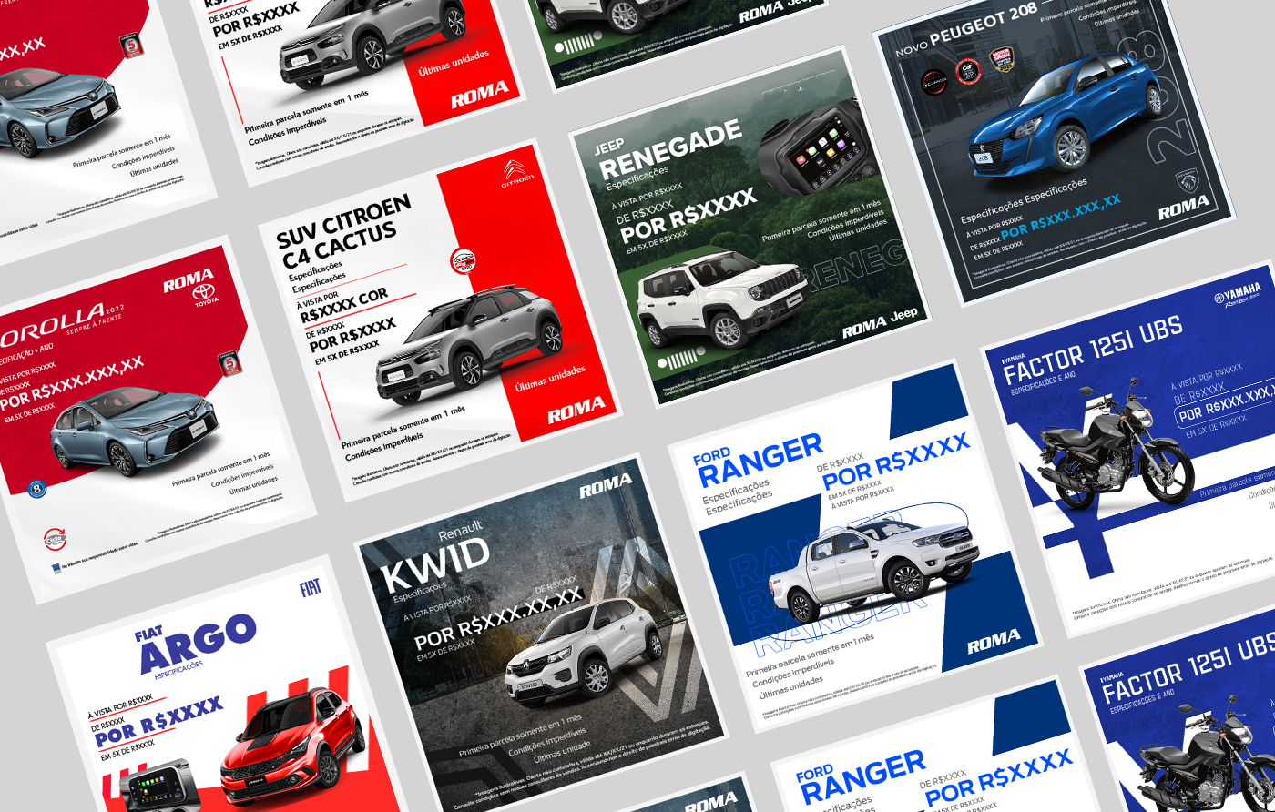 Esses foram os primeiros templates que criei para a Agência Reweb trabalhando com o cliente Grupo Roma. Foi extremamente desafiador criar essas artes, pois estava em um inicio de carreira e eram as primeiras artes que seriam exibidas na internet em grande escala, com certeza agregou muito para mim, foi um marco na minha evolução enquanto designer gráfico digital.